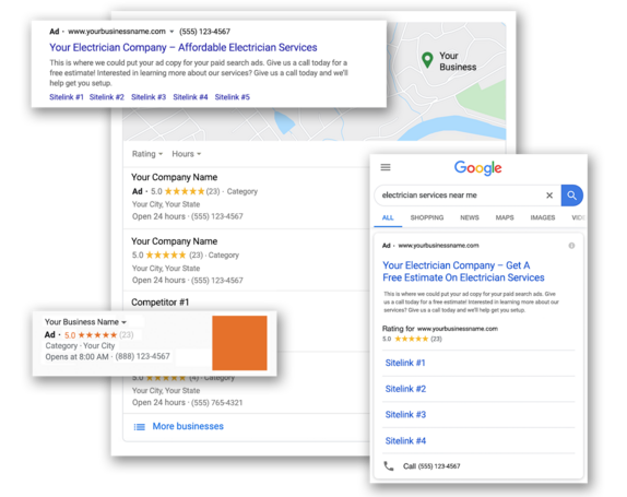 GET A FREE PROPOSALOne of the quickest ways to get your Electrical Business at the top of a search engines results page (SERP). These ads will allow your business to be shown when people are searching for your keywords on the SERP, Google Maps, Bing Maps, Gmail, and other search partner's websites. We will strategically research keywords, build your campaigns, write creative and compelling ad copy, and actively manage your campaign by making adjustments and tweaks to improve ROI. Our pay-per-click services include both Google Ads (formerly Google AdWords) and Bing ads.